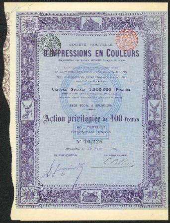 BELGIUM Societe Nouvelle D'Impressions En Couleurs stock certificate. Brussels. 1899