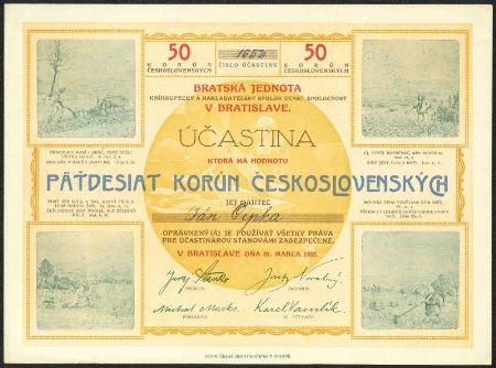 CZECHOSLOVAKIA Knihkupecky A Nakladatelsky Spolok Ucast stock certificate. Bratislava. 1922
