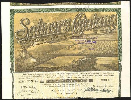 SPAIN Salinera Catalana stock certificate. Barcelona. 1946