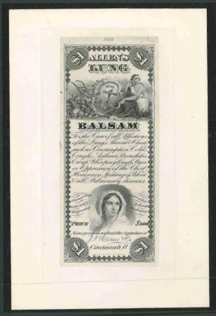 J.N. Harris & Co. Allen's Lung Balsam medicine label die proof, india die sunk on 151x228mm card. Cincinnati, Ohio. American Bank Note Co.die No. 1620. VF