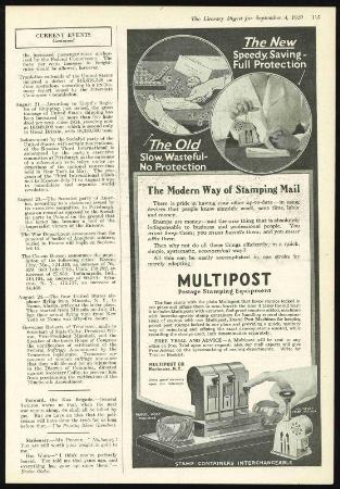 MULTIPOST Postage Stamping Equipment advertisement from The Literary Digest, September 4, 1920. Pictures the Multipost Stamp Affixer and a Parcel Post Machine. VF