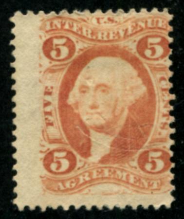 R23c short transfer at left, thick paper, cut cancel, F crease | Description |  | Scott R23c 1862-71 5c Agreement, red short transfer at left, thick paper, cut cancel, F crease |  | | Bidding |  |