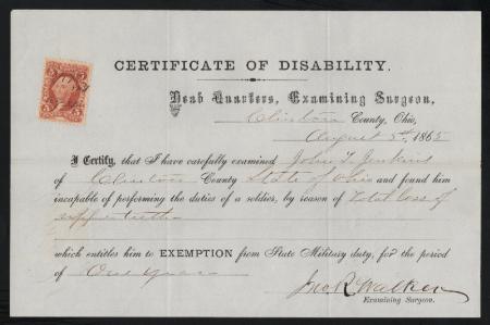 R24c Certificate of Disability for a soldier by reason of total loss of upper teeth. Clinton Co., Ohio. 1865. VF