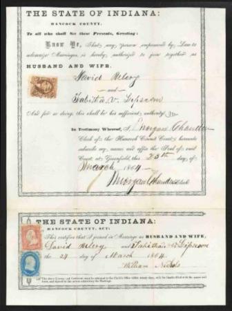 Marriage Certificate & License. Hancock County, Indiana. 1864. The postage stamps are paying the tax on the marriage certificate. F-VF reduced at top