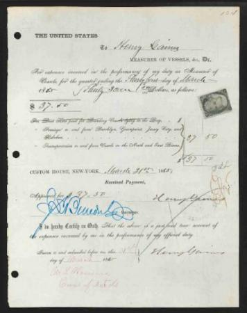 Certificate of expenses incurred in performance of duty as Measurer of Vessels. Custom House, New York. 1865. Ms. cancel, F-VF stamp is scissor separated