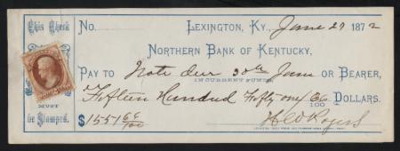 Northern Bank of Kentucky bank check. Lexington, Kentucky. 1872. Stamp is tied by a herringbone cut cancel, VF