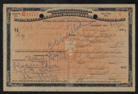 Prohibition Prescription Blank 3 Form Form No. 1403, Revised Feb. 1922, prefix C, used, VF two punch holes | Description |  | National Prohibiton Act Prescription Blank Smiley 3 1924 black, orange safety, red serial number Form No. 1403, Revised Feb. 1922, prefix C, used, VF two punch holes |  | | Bidding |  |