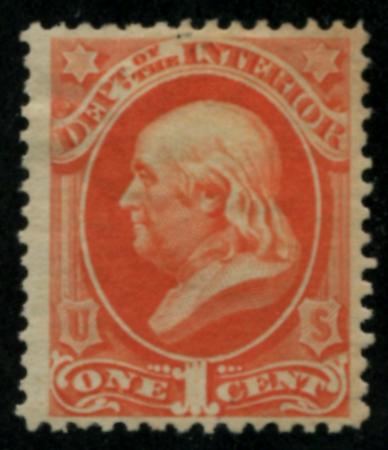 1873 1c Interior Department, vermilion (Benjamin Franklin)