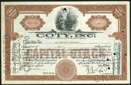 Coty, Inc. stock certificate for less than 100 shares. 1933.