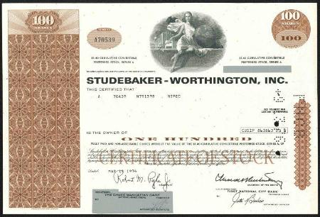 Studebaker-Worthington, Inc. stock certificate for 100 shares. 1974