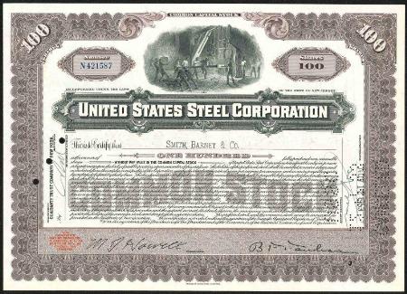 United States Steel Corporation stock certificate for 100 shares. 1953. American Bank Note Co. imprint. Neat vignette. Cancelled, VF