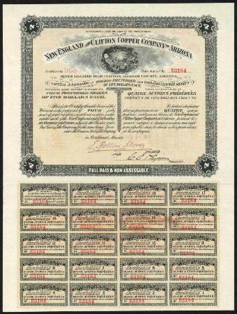 New England and Clifton Copper Company of Arizona stock certificate. Portland, Maine. 1906. Issued, VF