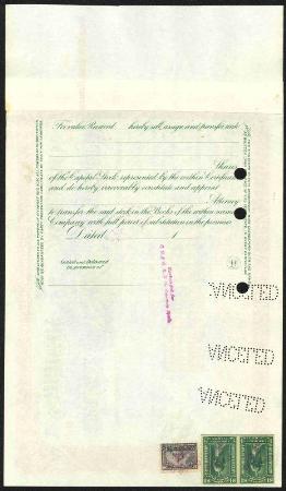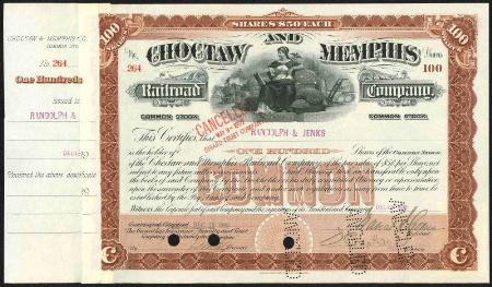 Choctaw & Memphis Railroad Company stock certificate for 100 shares. 1899. American Bank Note Company, Philadelphia. imprint. Cancelled, VF