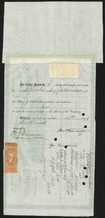 Columbus & Indianapolis Central Railway Company stock certificate. Columbus, Ohio. 1866. R45c & R44c