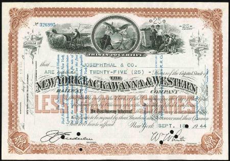 New York, Lackawanna & Western Railway Company stock certificate for less than 100 shares. New York, N.Y. 1944. American Bank Note Company, New York imprint. Farming and coal mining vignettes. Cancelled, VF
