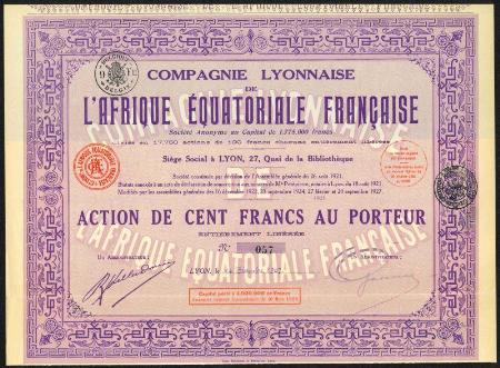FRANCE Compagnie Lyonnaise de L'Afrique Equatoriale Francaise stock certificate. Lyon. 1927