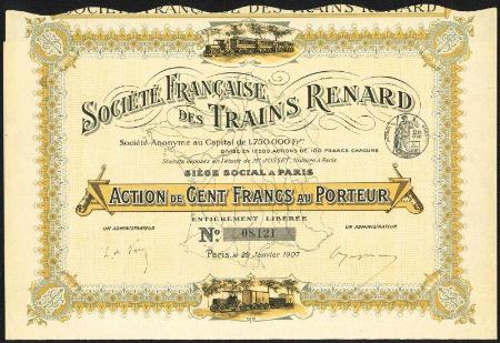 FRANCE Societe Francaise Des Trains Renard stock certificate. Paris. 1907