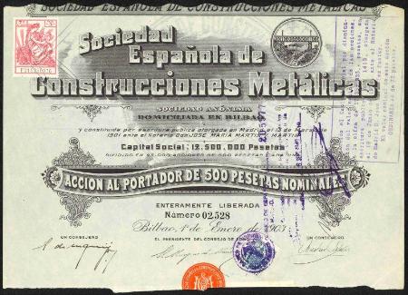SPAIN Sociedad Espanola de Construcciones Metalicas stock certificate. Bilbao. 1903. Spain revenue stamps