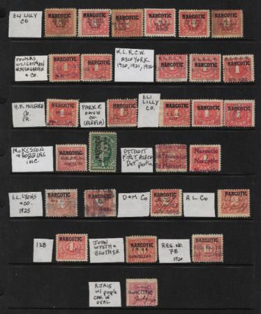 NARCOTIC TAX Revenue stamps, collection of 28 with printed, handstamp, perfin or manuscript company cancels | | Bidding |  |