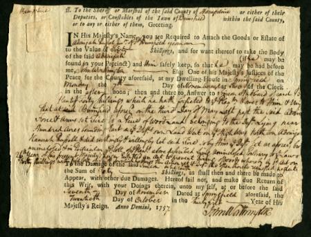 RM2 Writ of Attachment for the goods or estate of a man accused of setting fire to a piece of woodland and wanted for damages. Brimfield, Hampshire Co., Massachusetts. 1757. Sharp strike, ms. affects stamp, F-VF | Description |  | Scott RM2 1755-57 Massachusetts Colony 2p Codfish, embossed Writ of Attachment for the goods or estate of a man accused of setting fire to a piece of woodland and wanted for damages. Brimfield, Hampshire Co., Massachusetts. 1757. Sharp strike, ms. affects stamp, F-VF |  | | Bidding |  |