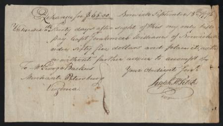 Inland bill of exchange. Norwich, Connecticut. 1798. F-VF toned and small flaws at right
