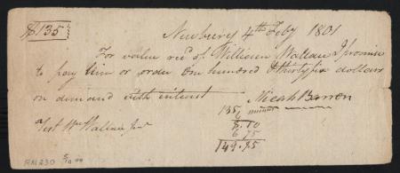 Promissory note. Newbury, Vermont. 1801. Manuscript and file fold affect stamp, VF