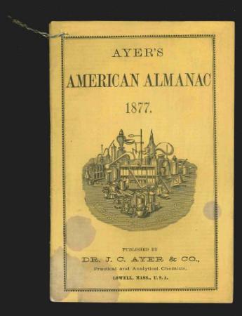 J.C. Ayer & Co. (RS2-RS13). Ayer's American Almanac 1877. 36 pages of testimonials, advice, calendar, and wit. | Description |  | J.C. Ayer & Co. Lowell, Massachusetts. Ayer's American Almanac 1876. 36 pages of testimonials, advice, calendar, and wit. F-VF stain on front cover. |  | | Bidding |  |