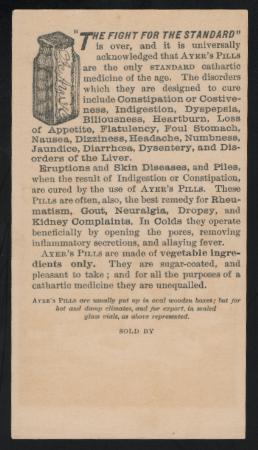 J.C. Ayer & Co. (RS2-RS13). Ayer's Pills, The Fight for the Standard trade card. Soldiers on horseback in battle, one carrying an Ayer's Pills battle flag, dead soldier and horse on the ground | Description |  | J.C. Ayer & Co. Lowell, Massachusetts Ayer's Pills, The Fight for the Standard trade card. Soldiers on horseback in battle, one carrying an Ayer's Pills battle flag, dead soldier and horse on the ground. VF mounting flaws on back |  |  | | Bidding |  |