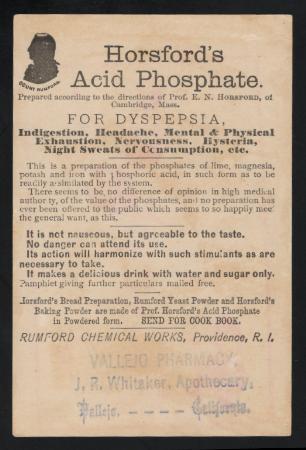 Rumford Chemical Works. (RS206-RS207). Horsford's Acid Phosphate for Mental & Physical Exhaustion, Dyspepsia & C. It makes a decicious drink with water & sugar only trade card