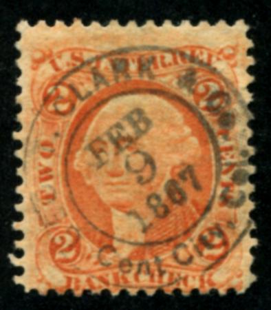 George T. Clark & Co. Central City, Colorado. R6c black SON cds, F | Description |  | George T. Clark & Co. Central City, Colorado Scott R6c 1862-71 2c Bank Check, orange black SON cds, F