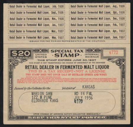 Retail Dealer in Fermented Malt Liquor F.Y.E. 1937 $20 black & red with coupons, VF light creases