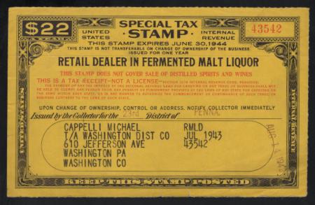 Retail Dealer in Fermented Malt Liquor F.Y.E. 1944 $22 black & red (orange s.c.), VF small faults