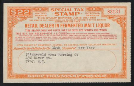Retail Dealer in Fermented Malt Liquor F.Y.E. 1953 $22 orange & red VF staple holes