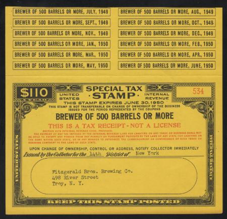 Brewer of 500 Barrels or More F.Y.E. 1950 $110 black & red (orange s.c.), VF crease and staple holes
