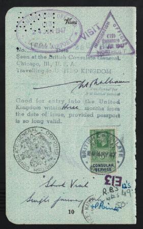 tied on passport page, British Consulate General, Chicago. 1947. VF