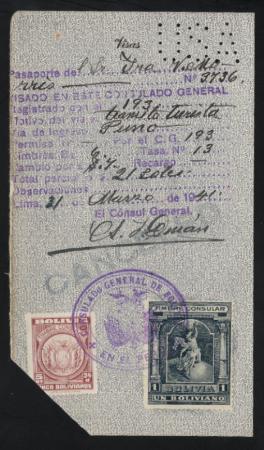 BOLIVIA Consular Revenue, 1B black & 5B red brown on a passport page. 1941