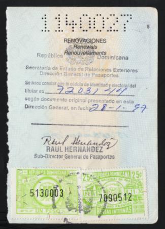 DOMINICAN REPUBLIC Rentas Internas 25c & 1P green tied on a passport page. 1997