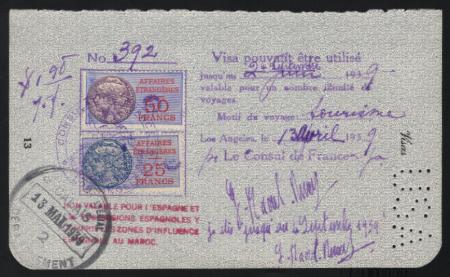 FRANCE Affaires Etrangeres 3 & 4 tied to a passport page. 1939. F-VF light soiling