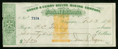 RN-B17c. Virginia, Nevada. Agency of The Bank of California, Gould & Curry Silver Mining Company bank check. 1870. Green on white. Used, F-VF