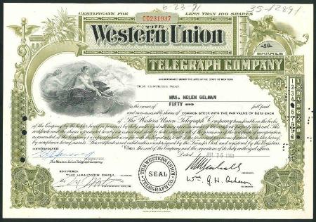 Western Union Telegraph Company stock certificate. 1963. American Bank Note Company imprint. Cancelled, VF