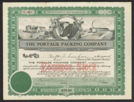 Portage Packing Company stock certificate. Akron, Ohio. 1920.
