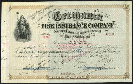 Germania Fire Insurance Company stock certificate. New York, N.Y. 1901.