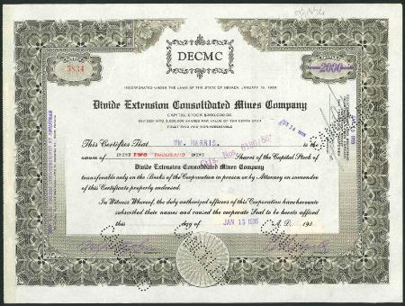 Divide Extension Consolidated Mining Company stock certificate. Reno, Nevada. 1935. Cancelled, VF