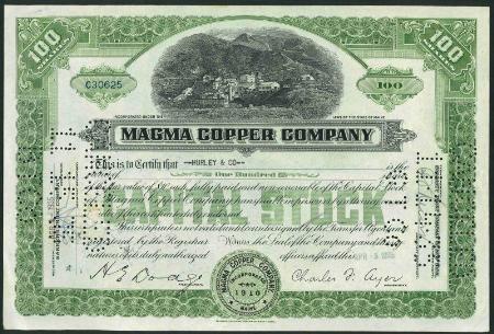 Magma Copper Company stock certificate for 100 shares. 1938. Hamilton Bank Note Company, New York, imprint. Mining vignette. Cancelled, VF