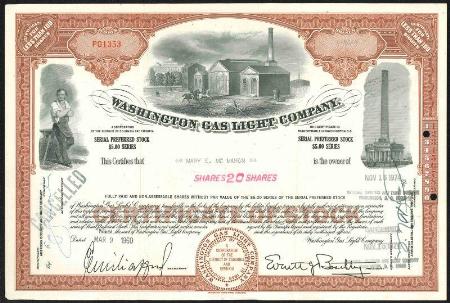 Washington Gas Light Company stock certificate for less than 100 shares. Washington, D.C. 1974 American Bank Note Co. imprint. Factory vignette. Cancelled, VF