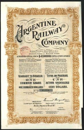 Argentgine Railway Company stock certificate. Buenos Aires. Issued, VF