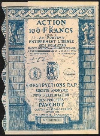 FRANCE Constructions P.A.P. Constructions P.A.P. stock certificate. Paris. 1923