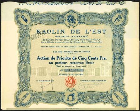 Kaolin De L'Est stock certificate. Haguenau, Rolute de Strasbourg. 1927. Issue, VF