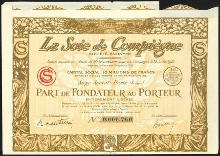 FRANCE La Soie de Compiegne stock certificate. Paris. 1923.