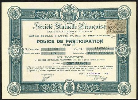 FRANCESociete Mutuelle Francaise participation certificate. Lyon. 1909. France revenue stamp